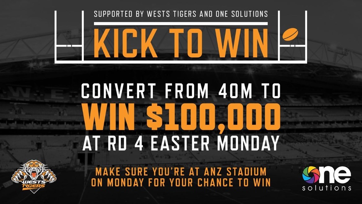 Wests Tigers, with the support of match day sponsors One Solutions, will give a fan the opportunity to kick for $100,000 at half-time of the Easter Monday blockbuster.