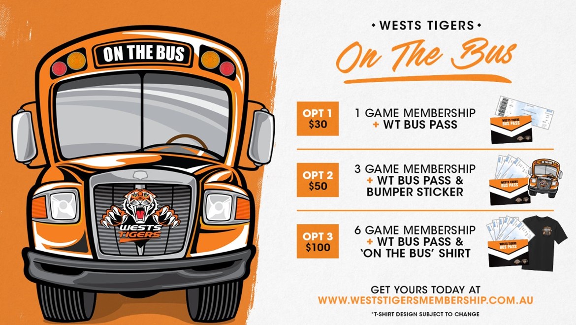 The best way to show your support is with a 6 Game Membership, Wests Tigers Bus Pass and a 'On The Bus' T-Shirt, all for just $100.