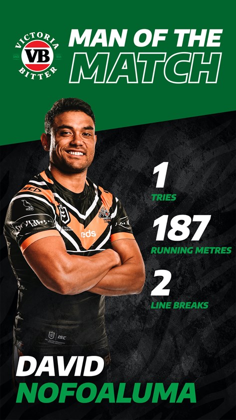 On a night where team performance stood out more than individual efforts, Wests Tigers winger David Nofoaluma capped off his night by taking out the VB Man of the Match award from Round 3.