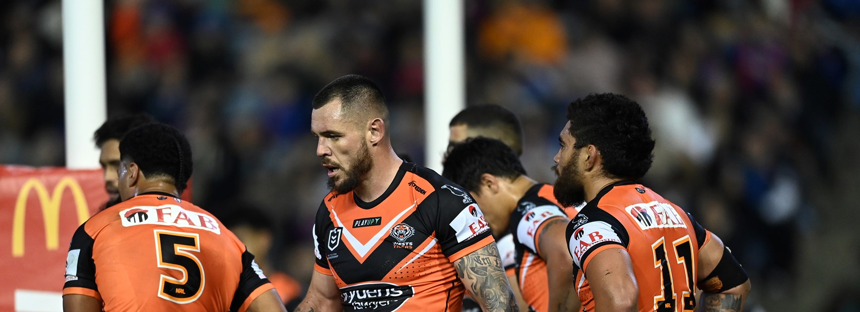 Wests Tigers were rewarded for their defensive scramble as a Brandon Wakeham grubber kick deflected into the arms of Api Koroisau, who emphatically grounded the ball in the in-goal area.