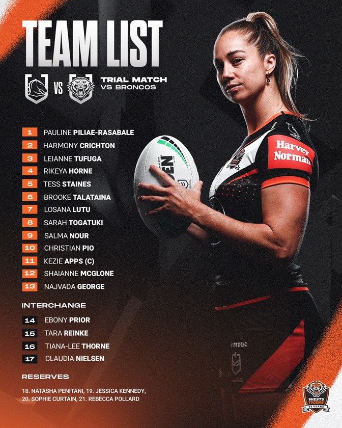 Wests Tigers NRLW Head Coach Brett Kimmorley has named his side to take on the Broncos for Saturday evening’s trial match in Brisbane.
